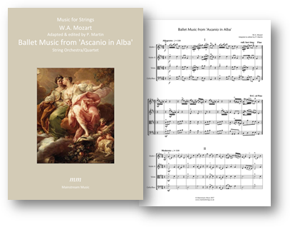 Six pieces from the young Mozart's 'Ballet Music from Ascanio in Alba', adapted and arranged for string orchestra/quartet. The PDF contains parts for violin II, doubling that of the viola, and double bass. Click here to listen to a recording of the piece.Click on the image below to view and listen to the score on YouTube.