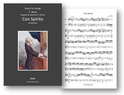 An adaptation for string duet of the second movement from Thomas Arne’s third organ concerto. The PDF contains versions for violin duet, violin and viola, violin and cello, viola duet and viola and cello. Click here to listen to a recording of the version for two violins. Click on the image below to view the score.
