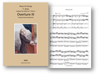 Arne's delightful and playable Overture III adapted for string orchestra. The repeats in the first movement are editorial. The smaller notes in the violin parts are included to facilitate less experienced players. The PDF contains a part for violin III doubling that of the viola. Click here to listen to a recording of the piece. Click on the image below to view the score.